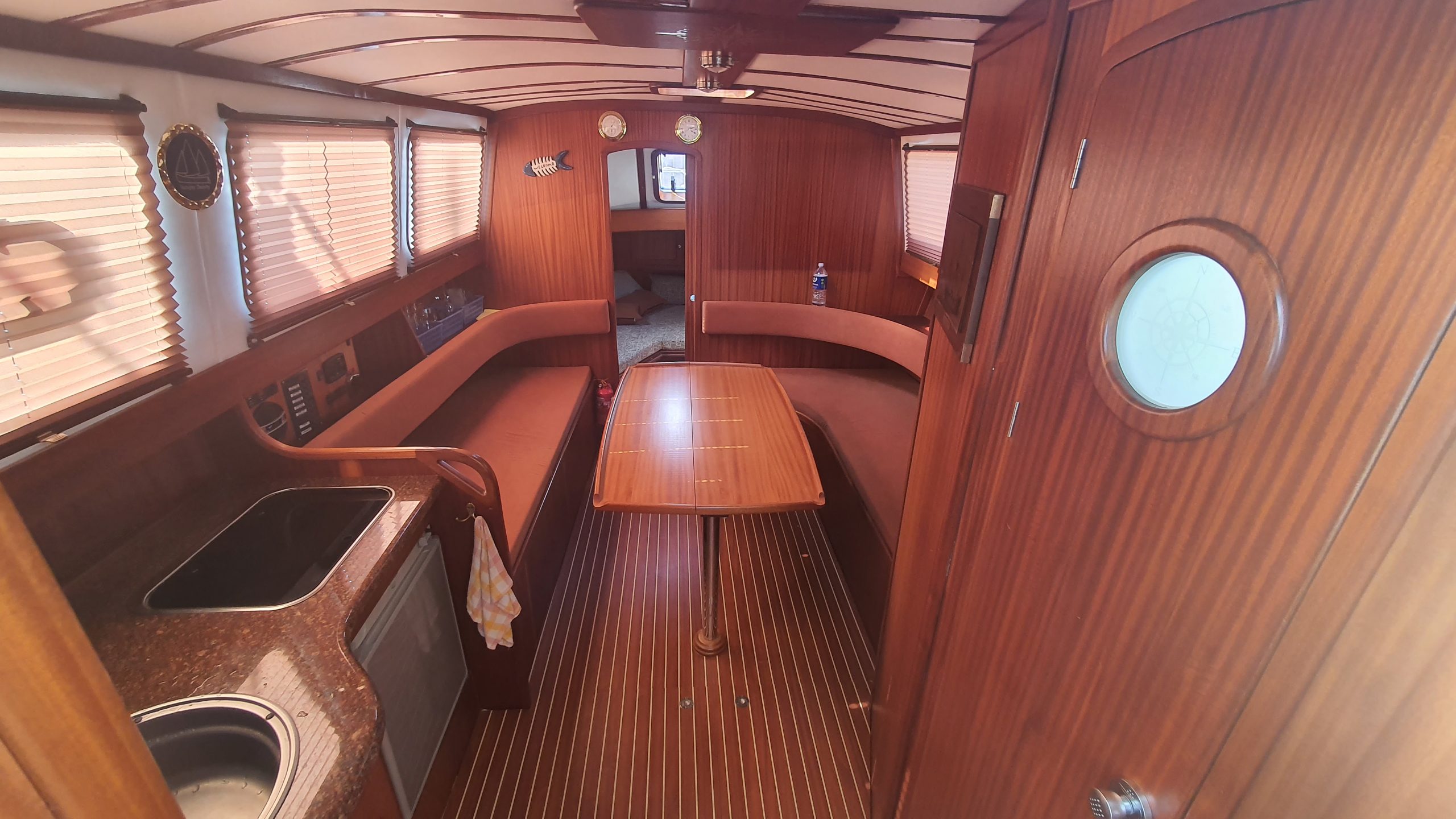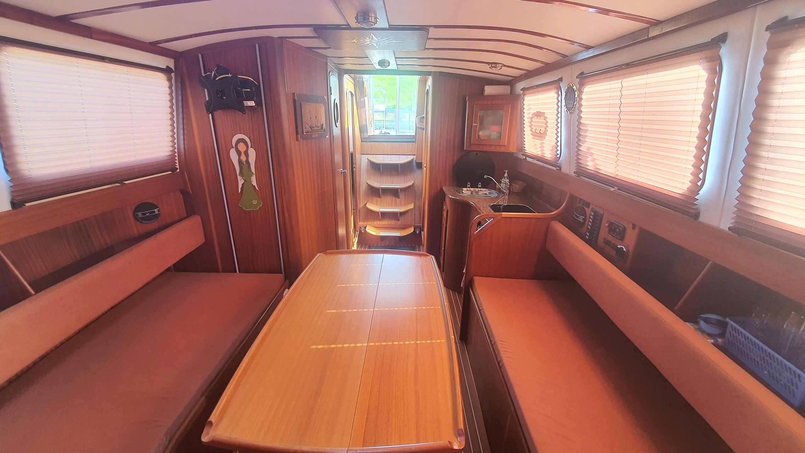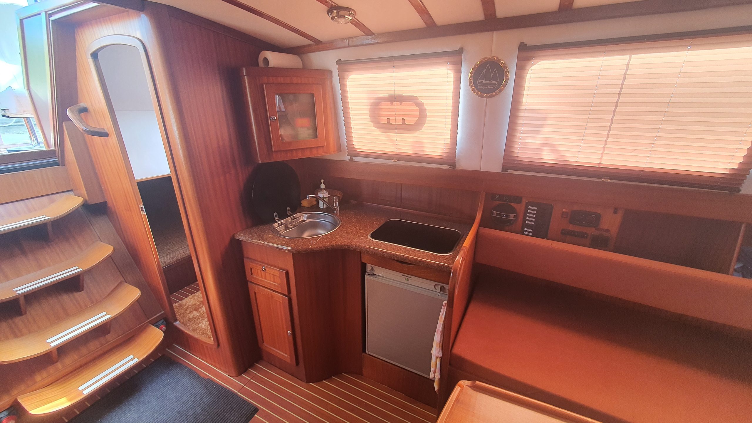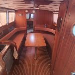 Laivo ilgis – 12m, plotis 3,1 m. Laive įrengtas nedidelis šaldytuvas WC, erdvus atviras denis ir komfortiška vidinė kajutė.